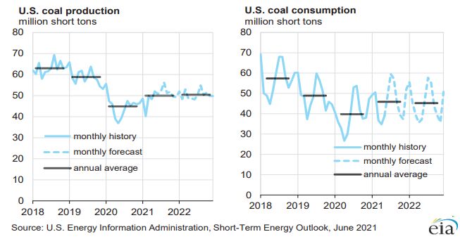 6月8日,美國(guó)能源信息署(EIA)發(fā)布《短期能源展望》(Short-Term Energy Outlook)顯示,2021年,美國(guó)煤炭產(chǎn)量預(yù)計(jì)將達(dá)到6億短噸(5.44億噸),較2020年實(shí)際產(chǎn)量增加6100萬短噸,增長(zhǎng)11%。