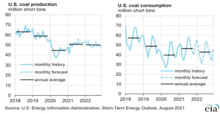 8月10日,美國能源信息署(EIA)發(fā)布最新《短期能源展望》報(bào)告顯示,2021年,美國煤炭產(chǎn)量預(yù)計(jì)為6.07億短噸(5.5億噸),同比增長13%,較前一月預(yù)期值減少1000萬短噸。 報(bào)告顯示,2022年,美國煤炭產(chǎn)量預(yù)計(jì)為6億短噸,較2021年預(yù)期值下降1.15%。