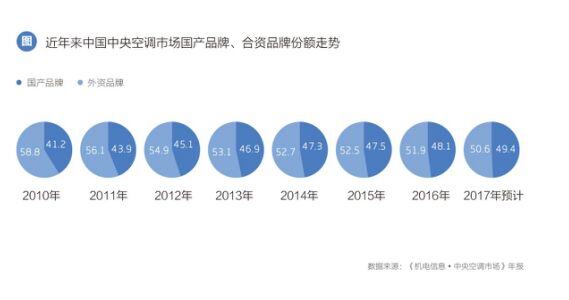 8月下旬,國內家電企業(yè)上市公司中期報告集中發(fā)布,幾大巨頭業(yè)績看點頗多。國產幾大家電企業(yè)無論是營業(yè)收入還是凈利潤都呈現大幅增長態(tài)勢。 緊跟其后“中國企業(yè)500強”榜單發(fā)布再次聚焦市場眼球。以海爾、美的、格力領銜的八家家電企業(yè)營收總規(guī)模突破8700億元。海爾以2016.08億元領跑,美的以1598.41億元排名101位緊隨其后。 幾大家電巨頭靚麗成績單的背后,空調產品扮演著極為重要的角色,特別是過去的一年,空調產業(yè)整體上升趨勢明顯,而其中中央空調作為近年來備受矚目的細分單元,盈利能力和市場增長速度都有大幅提升。 國內幾大行業(yè)媒體發(fā)布的2017年上半年中央空調市場報告顯示,2017年上半年中國中央空調市場整體增幅超過25%,半年容量首次突破400億元關口,市場信心空前高漲。 其中值得關注的是,以格力、海爾、美的為代表的國產品牌占比份額再次提升。公開的數據顯示,2010年國產品牌中央空調占比41.2%,而到2016年年底,這個數字變成了48.1%,進展勢頭不似家用空調當年開疆拓土時摧枯拉朽,但筆者認為改變的力量已經形成并積聚。隨著 “國進外退”的整體趨勢推導,國家對綠色節(jié)能技術扶持力度持續(xù)加大,國產品牌超越外資成為市場主角的趨勢已然客觀存在。國內幾大中央空調市場研究機構一致預測,國產品牌市場占比將會在2018年全面超越外資品牌。