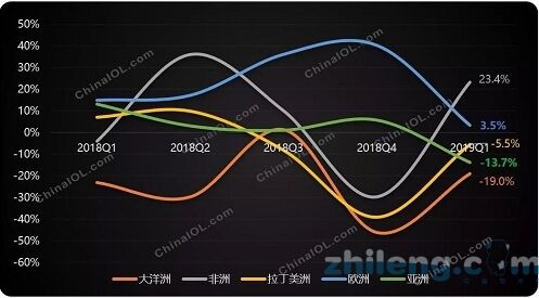 美的為了更快開辟國際市場,搶占市場份額,與國內(nèi)市場的銷售策略一致,同步降低了出口價格。此外,美的利用其在海外完善的銷售渠道,自主品牌出口占比也有了提升。 TCL增長有兩方面原因,一是采取集團統(tǒng)一銷售的策略,TCL旗下有多媒體、手機、環(huán)境電器等多種產(chǎn)品,統(tǒng)一之后拓寬了銷售渠道;二是推出了一款體積更小、重量更輕的窗機,在北美及歐洲很受歡迎,由此帶來了可觀的增長。 海信在出口方面增長最為亮眼,同比達到15.7%,并且在北美、拉美和亞洲均有不錯的增長。原因之一是得益于海信多產(chǎn)品、多渠道的協(xié)同作用,二是去年基數(shù)相對較小。 趨勢:后續(xù)拐點已現(xiàn) 從分季度的各洲別出口增長率情況來看,2019年一季度僅有非洲和歐洲有不同幅度的增長。不過因為非洲這幾年的出口表現(xiàn)一直不太穩(wěn)定,整體規(guī)模較高峰期出現(xiàn)較大萎縮,而且在全球市場中所占份額較小,不足以影響整體出口趨勢。歐洲這兩年一直保持了較高的增長,但今年一季度的市場增長也出現(xiàn)疲軟,整體增速大幅收窄。 而主力需求區(qū)域亞洲的增長率在步步走低。拉美地區(qū)的局勢也并不樂觀,整體降幅仍在雙位數(shù)以上。北美地區(qū)如前文所述,因為美國市場的提前透支出現(xiàn)雙位數(shù)下滑,從月度的趨勢來看也是如此,后續(xù)承壓顯著。