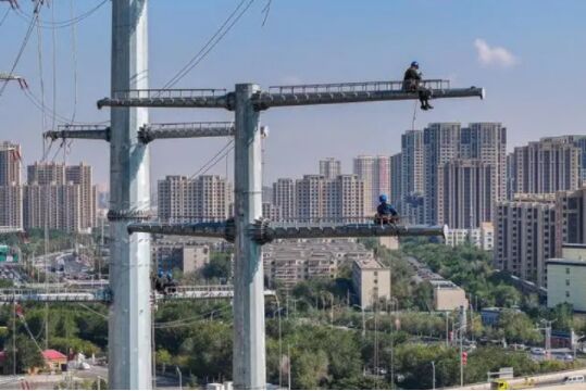 烏魯木齊一處電力施工現(xiàn)場(chǎng),工人正在鐵塔上架設(shè)導(dǎo)線。(劉元寶 攝)