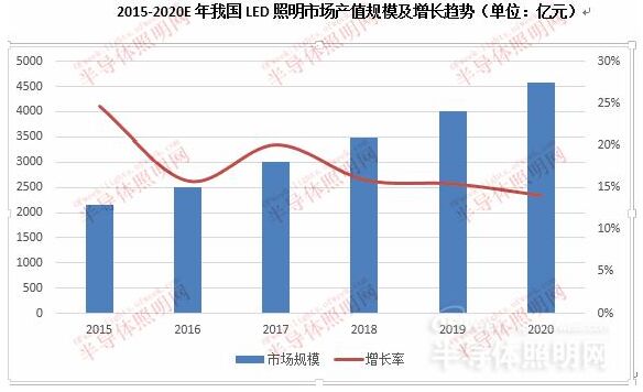 2015-2020E年我國LED照明市場產(chǎn)值規(guī)模及增長趨勢(shì) 數(shù)據(jù)來源:OFweek產(chǎn)業(yè)研究院