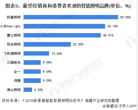 行業(yè)競爭逐漸激烈 2011年國家發(fā)改委等五部委發(fā)布了“中國逐步淘汰白熾燈路線圖”,提出白熾燈淘汰步驟。隨后,2015年2月份,亞明、陽光、鴻雁、歐普、飛利浦、木林森、科瑞、銳高、瑩輝、柏年、鼎暉、頓格等13家企業(yè)與結(jié)盟,簽訂了《共建智能照明聯(lián)合聲明》,抱團(tuán)推廣智能照明。另一邊,照明企業(yè)也在謀求和互聯(lián)網(wǎng)企業(yè)的合作。2016年,與華為開始戰(zhàn)略合作,并在華為HiLink智慧家庭生態(tài)發(fā)布會上發(fā)布了合作后的首批產(chǎn)品。智能也和鴻雁電器達(dá)成合作。 根據(jù)智哪兒、、雷士照明、昕諾飛、涂鴉智能、上海聯(lián)通、華藝廣場、億美光電等一線單位和近20家的相關(guān)企業(yè)聯(lián)合編制的《2019新渠道智能家居照明白皮書》顯示,目前中國主要的智能照明品牌有歐普照明、小米Yeelight、雷士照明、陽光照明、飛利浦照明等,在《2019新渠道智能家居照明白皮書》調(diào)研中,上述品牌在“最受經(jīng)銷商和消費(fèi)者歡迎的智能照明品牌”選項(xiàng)中占比分別為50%、43.18%、40.91%、25%、13.64%。 此外,在智能家居照明領(lǐng)域,阿里、騰訊、小米、海爾等互聯(lián)網(wǎng)、家電企業(yè)也跨界而來,開始照明設(shè)計(jì)和照明銷售,試圖打造自己的智能生態(tài)圈。