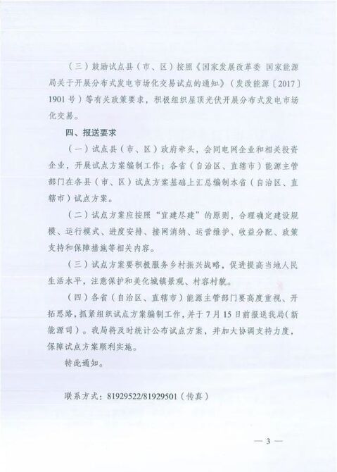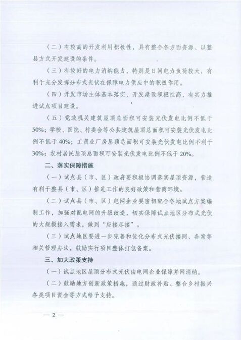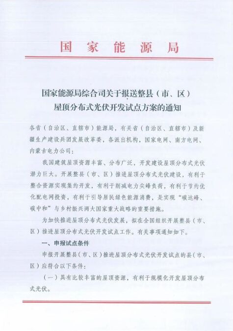 近日,國家能源局綜合司下發(fā)《關(guān)于報(bào)送整縣(市、區(qū))屋頂分布式光伏開發(fā)試點(diǎn)方案的通知》。 《通知》指出,我國建筑屋頂資源豐富、分布廣泛,開發(fā)建設(shè)屋頂分布式光伏潛力巨大。開展整縣(市、區(qū))推進(jìn)屋頂分布式光伏建設(shè),有利于整合資源實(shí)現(xiàn)集約開發(fā),有利于削減電力尖峰負(fù)荷,有利于節(jié)約優(yōu)化配電網(wǎng)投資,有利于引導(dǎo)居民綠色能源消費(fèi),是實(shí)現(xiàn)“碳達(dá)峰、碳中和”與鄉(xiāng)村振興兩大國家重大戰(zhàn)略的重要措施。 《通知》還指出了申請(qǐng)?jiān)圏c(diǎn)條件,要求具有豐富的屋頂資源;有較高的開發(fā)利用積極性;有較好的電力消納能力;開發(fā)市場(chǎng)主體基本落實(shí),開發(fā)建設(shè)積極性高,有實(shí)力推進(jìn)試點(diǎn)項(xiàng)目建設(shè)。 此外,《通知》還提到黨政機(jī)關(guān)建筑屋頂總面積可安裝光伏發(fā)電比例不低于50%;學(xué)校、醫(yī)院、村委會(huì)等公共建筑屋頂總面積可安裝光伏發(fā)電比例不低于40%;工商業(yè)廠房屋頂總面積可安裝光伏發(fā)電比例不低于30%;農(nóng)村居民屋頂總面積可安裝光伏發(fā)電比例不低于20%。 原文如下: