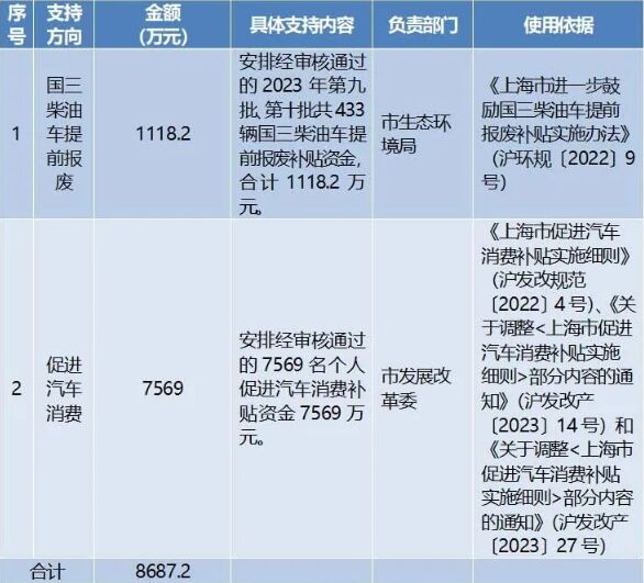 2、按照《上海市促進(jìn)汽車(chē)消費(fèi)補(bǔ)貼實(shí)施細(xì)則》(滬發(fā)改規(guī)范〔2022〕4號(hào))、《關(guān)于調(diào)整<上海市促進(jìn)汽車(chē)消費(fèi)補(bǔ)貼實(shí)施細(xì)則>部分內(nèi)容的通知》(滬發(fā)改產(chǎn)〔2023〕14號(hào))和《關(guān)于調(diào)整<上海市促進(jìn)汽車(chē)消費(fèi)補(bǔ)貼實(shí)施細(xì)則>部分內(nèi)容的通知》(滬發(fā)改產(chǎn)〔2023〕27號(hào))規(guī)定,安排經(jīng)審核通過(guò)的7569名個(gè)人促進(jìn)汽車(chē)消費(fèi)補(bǔ)貼資金共計(jì)7569萬(wàn)元。