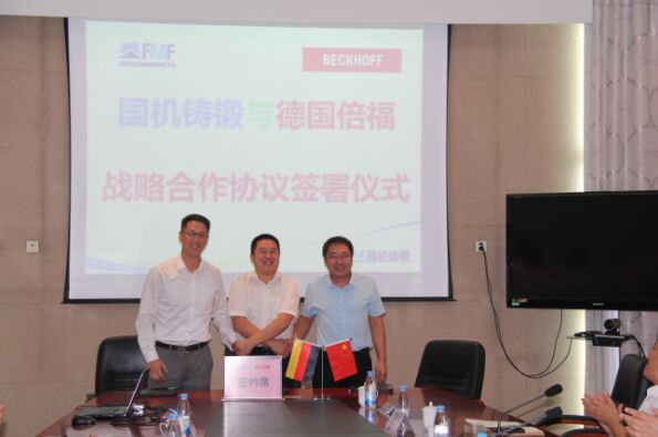 國(guó)機(jī)鑄鍛副總經(jīng)理李峰先生主持簽約儀式并對(duì)倍福各級(jí)領(lǐng)導(dǎo)的到來(lái)表示熱烈的歡迎。國(guó)機(jī)鑄鍛龐總表示: “國(guó)機(jī)鑄鍛的上級(jí)單位中汽工程很早就與倍福開展了合作,國(guó)機(jī)鑄鍛作為一家市場(chǎng)驅(qū)動(dòng)型企業(yè)通過(guò)不斷的技術(shù)創(chuàng)新從而形成國(guó)機(jī)鑄鍛的核心競(jìng)爭(zhēng)力!2018年4月,國(guó)機(jī)鑄鍛在參加德國(guó)漢諾威展覽會(huì)期間參觀了倍福展臺(tái)并考察了倍福德國(guó)總部工廠,對(duì)倍福的基于PC的控制技術(shù)和EtherCAT一網(wǎng)到底的技術(shù)表示贊賞,并希望與倍福公司共謀未來(lái)發(fā)展,實(shí)現(xiàn)合作共贏。 倍福中國(guó)運(yùn)營(yíng)總監(jiān)馬興凱表示:“國(guó)機(jī)鑄鍛在鑄造鍛壓行業(yè)已處于國(guó)際領(lǐng)先地位,國(guó)機(jī)鑄鍛對(duì)倍福的認(rèn)可和信任我們表示衷心感謝。國(guó)機(jī)鑄鍛是倍福的客戶更是倍福的朋友,希望雙方能夠進(jìn)一步加強(qiáng)溝通與交流,實(shí)現(xiàn)共同發(fā)展!