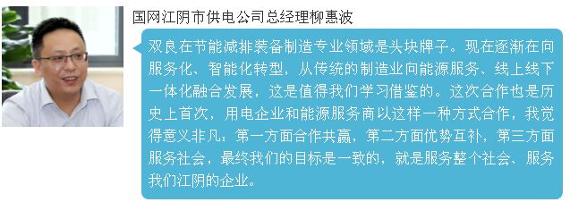 雙良節(jié)能繆文彬董事長 與國網(wǎng)江陰市供電公司總經(jīng)理柳惠波簽約 合作內(nèi)容 凝聚雙方優(yōu)勢,推動社會能效提升 信息技術(shù)共享,共建能源互聯(lián)網(wǎng)平臺 推動產(chǎn)業(yè)聯(lián)盟,構(gòu)建能源服務(wù)新業(yè)態(tài) 加強(qiáng)優(yōu)勢互補(bǔ),培育科研技術(shù)成果