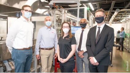 (左起)倍福團隊成員應(yīng)用開發(fā)工程師 John Helfrich、區(qū)域銷售工程師 Charles Usher 和應(yīng)用工程師 Lauren de Rosset 與 Glidewell 公司的自動化部經(jīng)理 Kunal Patil 以及工程副總 David Leeson 密切合作