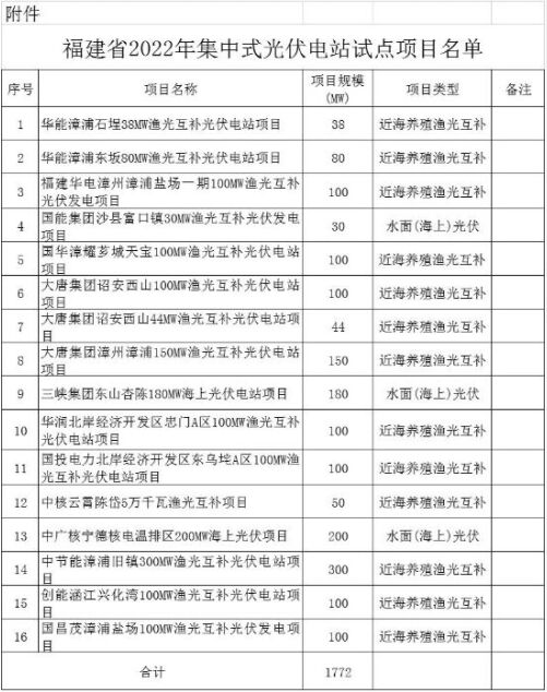 10月20日,福建省發(fā)展和改革委員會(huì)發(fā)布關(guān)于公布2022年集中式光伏電站試點(diǎn)項(xiàng)目名單的通知,本次集中式光伏電站試點(diǎn)項(xiàng)目共16個(gè)、1772MW。