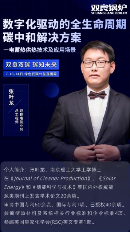7月11日,雙良鍋爐電能業(yè)務(wù)部總工程師張葉龍博士,被特邀作了題為“數(shù)字化驅(qū)動下的全生命周期碳中和解決方案-電蓄熱供熱技術(shù)及應(yīng)用場景”的演講。