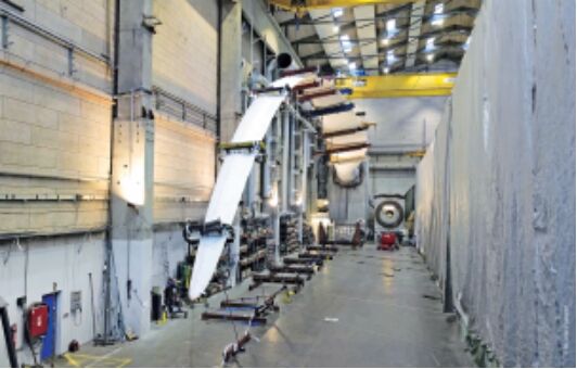 數(shù)百個應(yīng)變片用于測量牽引工位(在背景)啟動的 100 米長的轉(zhuǎn)子葉片工作時產(chǎn)生的力和振動。