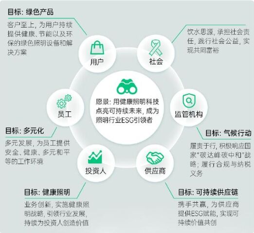 值得一提的事,雷士照明于近日正式發(fā)布了ESG治理體系,前瞻性地將ESG融入企業(yè)發(fā)展戰(zhàn)略。雷士照明構(gòu)建了科學(xué)、完善的ESG治理體系,包括“用照明科技點(diǎn)亮可持續(xù)未來(lái),成為照明行業(yè)ESG引領(lǐng)者”的愿景及6大ESG戰(zhàn)略目標(biāo)、15個(gè)ESG議題,成立ESG專(zhuān)項(xiàng)管理委員會(huì)并制定覆蓋目標(biāo)管理、議題統(tǒng)籌、信息披露、風(fēng)險(xiǎn)管理的ESG管理制度。