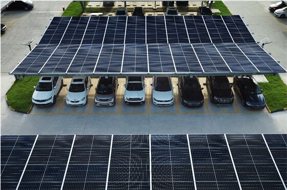 基地還打造了光伏停車棚,車棚與光伏發(fā)電完美結(jié)合,是太陽能發(fā)電在社會(huì)生活應(yīng)用的環(huán)保示范。這一舉措,不僅解決了露天條件下停車的高溫問題,還能利用車棚閑置空間進(jìn)行發(fā)電,自發(fā)自用,余電上網(wǎng),最大限度提高綠色清潔電力使用效率,集合了停車空間、屋頂發(fā)電、建筑美學(xué)三大功能。該光伏停車棚面積4614平方米,可容納220輛機(jī)動(dòng)車及400余輛非機(jī)動(dòng)車,年發(fā)電量可達(dá)92萬度。此外,基地還安裝了200盞太陽能路燈,每年可節(jié)約3萬度清潔電力,相當(dāng)于減少碳排放17.72噸。