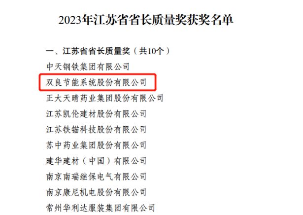 近日,2023年江蘇省省長質(zhì)量獎(jiǎng)獲獎(jiǎng)名單正式公布,雙良節(jié)能系統(tǒng)股份有限公司憑借多年來在踐行綠色發(fā)展和推動(dòng)高質(zhì)量發(fā)展方面的堅(jiān)守與擔(dān)當(dāng),贏得了江蘇省人民政府的肯定與嘉獎(jiǎng),榮獲2023年江蘇省省長質(zhì)量獎(jiǎng)。