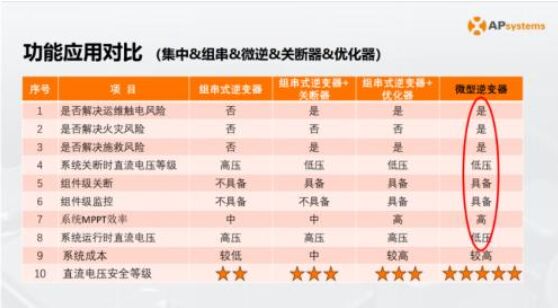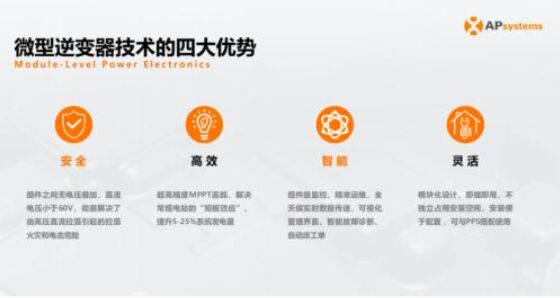 伴隨分布式光伏的加速滲透,安全、智能、靈活逐漸成為光伏逆變器重要的衡量標準,以微型逆變器為代表的MLPE的技術(shù)優(yōu)勢也日益凸顯。對此,周總綜合對比組串式逆變器、微型逆變器、關(guān)斷器和優(yōu)化器的技術(shù)特點,指出:微型逆變器技術(shù)路線具有安全、高效、智能、靈活四大優(yōu)勢。