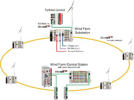 國標中所有要求的參考點只有一個:風電場公共并網點,所以對風電場并網點的電壓值、電流值的監(jiān)測極其重要。并網點電量值的快速采集,需要高精度、高采樣率的測量設備,最好能高速的得到并網點電壓和電流的瞬時值。 具有XFC超采樣技術的電力測量模塊EL3773對風電場并網點進行監(jiān)控。倍福工業(yè) PC上運行的能量管理平臺通過EtherCAT光纖耦合器或光電轉換模塊接入到風電場實時網絡,采集風電場并網點處和每臺風機并網側的電網狀況,通過能量管理平臺軟件統(tǒng)一調控整個風電場的電壓、頻率、有功出力和無功等。 2.2 通訊架構: ①風場實時網絡為環(huán)網方式,使用光纖(單模光纖最遠20km,多模光纖最遠2km)通過EtherCAT總線和相應的耦合器EK1501把風場的風機連接成通訊環(huán)網。風場中的每臺風機的主控制器CX5020可通過EtherCAT 網橋模塊EL6695實現(xiàn)與能量管理平臺的實時通訊。 ②EtherCAT采用開放的實時以太網通訊協(xié)議,是一種高速以太網現(xiàn)場總線,由德國倍福自動化有限公司研發(fā)。EtherCAT為系統(tǒng)的實時性能和拓撲的靈活性樹立了新的標準,分布于100個節(jié)點的1000個開關量刷新時間僅為30µs,同時,它還明顯降低了現(xiàn)場總線成本。EtherCAT的特點還包括分布式時鐘,可選線纜冗余和功能性安全協(xié)議(SIL3)。采用XFC(極速控制)技術后,利用時間戳可獲得小于100 ns的時間分辨率。 2.3 開放性與兼容性 EtherCA系統(tǒng)具有很強的開放性,該解決方案也可與第三方供應商的控制器一起使用。倍?商峁┡c常見的場總線系統(tǒng)(例如 PROFIBUS、PROFINET 和 CANopen等)橋接的EtherCAT模塊,包括主站和從站與,EtherCAT網絡可以使用這些總線與第三方控制器通訊。 3.技術亮點的詳細介紹 3.1 EtherCAT網絡 作為快速、實時的總線系統(tǒng),EtherCAT 使得倍福的風電場實時電力監(jiān)控網絡解決方案變得更加完美。EtherCAT于2014年成為了中國的國家推薦標準《GB/T 31230-2014 工業(yè)以太網現(xiàn)場總線EtherCAT》[3],它不僅成為了控制現(xiàn)場總線,還成為了測量現(xiàn)場總線。只有這種基于以太網且具有高度確定性的高速現(xiàn)場總線協(xié)議才能實現(xiàn)諸如狀態(tài)監(jiān)測集成的復雜應用。有了全雙工快速以太網和幾微秒的總線周期,EtherCAT 功能原則的有用數(shù)據(jù)傳輸率遠遠超過 90%。連同后面提到的超采樣功能和 EtherCAT 從站中的直接數(shù)值緩沖,采樣率可遠遠超過實際的總線周期。 3.2 超高速的功率測量模塊,可達10,000采樣點/秒 通過 EtherCAT 還實現(xiàn)了其它新技術:例如,數(shù)字量輸入模塊EL1262能夠以高達1百萬采樣點/秒的速度掃描信號。例如,超采樣功能使得頻率高達100 kHz 的信號測量或輸出成為可能。例如,借助于EtherCAT功率測量端子模塊EL3773,超采樣技術可用于測量電網并網點的電流和電壓。采樣頻率可達10 KHz。 電網監(jiān)控端子模塊EL3773設計用于監(jiān)控三相交流電壓系統(tǒng)的狀態(tài)。在 EtherCAT超采樣原理的基礎上,能夠以時間分辨率最高達100 μs的速度同時測量三相電壓和電流共計六個通道,然后把采集到的電壓、電流的真實傳輸至控制器。EL3773 支持分布式時鐘系統(tǒng),因此,能夠與其它EtherCAT設備一起同步進行測量。 3.3 EtherCAT分布式時鐘,確保采集信號的同步性 EtherCAT設備的分布式時鐘功能的分辨率為1 ns且精確度為10 ns,使得測量值和控制值的同步時間窗口能小于1 μs,甚至小于100 納秒。EtherCAT 拓撲中的所有分布式時鐘在進行時鐘同步時已計算了傳輸延遲的影響;谶@項功能,可以確保整個風電場網絡中的數(shù)據(jù)采樣在時間上保持同步。使用這項技術甚至還可以實現(xiàn)風場內的各風機變流器的 IGBT同步。鑒于此,風力發(fā)電機組制造商和變流器供應商都已經參與進來了。 3.4 同步大數(shù)據(jù)的采集 隨著風電領域研究的深入,風電場網絡還被賦予了大數(shù)據(jù)采集的期待。風場級大數(shù)據(jù),可用于分析風機尾流影響;優(yōu)化風電場扇區(qū)控制,優(yōu)化風電場分布式能量管理控制;優(yōu)化風機參數(shù),提高風機功率;達到風電場全生命周期管理的目的。所有的數(shù)據(jù),都是“各個風機的同步數(shù)據(jù)”,否則得到的數(shù)據(jù)對于數(shù)據(jù)分析的意義將會大大的降低。在使用GPS對時功能之后,現(xiàn)有的風電場網絡中的各個風機的時鐘同步也是在“幾百毫秒”級別的,其他的測量值,例如風速、風向等數(shù)據(jù)的同步性,更加無法保證。EtherCAT設備的分布式時鐘功能可以確保整個風電場網絡中的數(shù)據(jù)采樣在時間上保持同步。 EtherCAT明顯增加了系統(tǒng)速度:一個包含1,500字節(jié)的EtherCAT報文可由主機在 77μs的時間內完成發(fā)送和再次接收。假設每臺風力發(fā)電機組的過程映象區(qū)為50輸入字節(jié)和50輸出字節(jié),那么具有150臺風力發(fā)電機組的風場的過程映象區(qū)可以在小于1ms的時間內刷新。如果速度要求更快或風力發(fā)電機組數(shù)量明顯增加,那么可在一臺主機上實現(xiàn)多個EtherCAT環(huán)網。 4 結束語 風場網絡控制的重要性越來越突出,海上風電場尤其重視這個環(huán)節(jié)。德國對海上風電場的要求嚴格,在海上風電場設計初期,就必須建立風電場的仿真模型,對風電場的控制網絡有嚴格的規(guī)定。全套系統(tǒn
