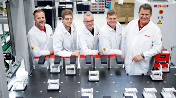 如此精密的系統(tǒng)只能由一個(gè)完整的團(tuán)隊(duì)進(jìn)行設(shè)計(jì)和實(shí)施才能完成(倍福專家團(tuán)隊(duì),左起):Daniel Golz(機(jī)械設(shè)計(jì))、Mathis Blattner(測(cè)試柜軟件開發(fā))、Ulrich Brockhaus(系統(tǒng)編程)、Stefan Engelke(測(cè)試設(shè)備開發(fā))和 Michael Golz(演示系統(tǒng)部門主管)