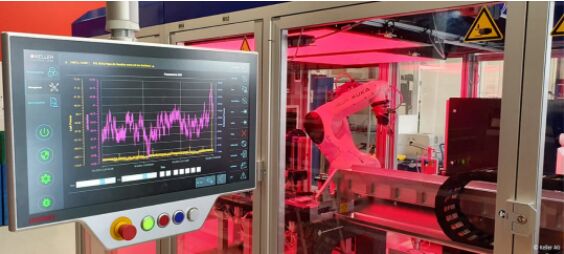 壓印是傳感器隔離膜片生產(chǎn)過程中一個(gè)不可或缺的的中間加工步驟,凱樂公司項(xiàng)目經(jīng)理 Florian Wernli 解釋道:“我們的大部分壓力傳感器都封裝在充油不銹鋼外殼中。隔離膜片對于通過油將周圍介質(zhì)的壓力傳輸至傳感器內(nèi)的測量芯片中來說至關(guān)重要。”這就需要通過一臺性能強(qiáng)大的自動壓印機(jī)將隔離膜片壓印成特殊的形狀。凱樂公司開發(fā)與生產(chǎn)裝備部 Bruno Thalmann 補(bǔ)充道:“在經(jīng)過泄漏檢測、用壓縮空氣清潔和熱平衡處理后,我們在同一工藝步驟中使用氫傳感器在高壓條件下進(jìn)行壓印并進(jìn)行確定性泄漏試驗(yàn)。隨后使用圖像處理和人工智能進(jìn)行誤差檢測!眽河C(jī)的核心部分是一臺 KUKA 機(jī)器人,它用作拾放單元,將坯件送至加工位置,并將已完成的工件分成合格品(OK)和不合格品(NOK)兩個(gè)部分。