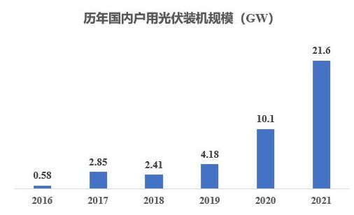 2019年以來(lái),戶用光伏被給予單獨(dú)的補(bǔ)貼,得到快速的發(fā)展。從2018年開(kāi)始,裝機(jī)規(guī)模幾乎每年翻一番,詳見(jiàn)下圖。