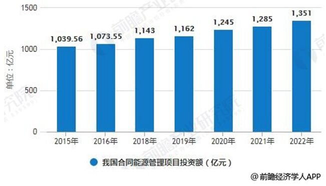 中國合同能源管理項目投資額分析預(yù)測 2015年,我國合同能源管理項目投資額為1039.56億元,同比增長8.43%。到了2016年我國合同能源管理項目投資額為1073.55億元,同比增長3.27%。綜合以上因素,預(yù)計2018年我國合同能源管理項目投資額將達到1143億元,未來五年(2018-2022)年均復(fù)合增長率約為4.26%,預(yù)測到了2022年我國合同能源管理項目投資額將達到1351億元。
