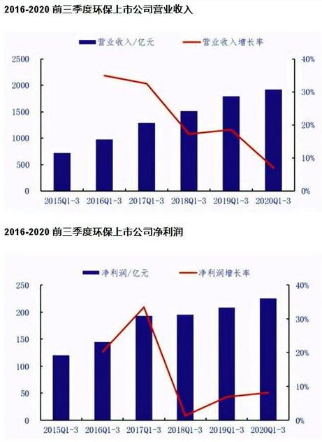 統(tǒng)計數(shù)據(jù)顯示,今年前三季度,我國環(huán)保相關(guān)上市公司營業(yè)收入同比增長7.1%,凈利潤同比增長8.1%。 生態(tài)環(huán)境部科技與財務(wù)司、中國環(huán)境保護(hù)產(chǎn)業(yè)協(xié)會日前聯(lián)合發(fā)布的《中國環(huán)保產(chǎn)業(yè)發(fā)展?fàn)顩r報告(2020)》稱,2019年全國環(huán)保產(chǎn)業(yè)營業(yè)收入約17800億元,較2018年增長約11.3%。報告預(yù)測,2021年我國環(huán)保產(chǎn)業(yè)營業(yè)收入總額有望超過2萬億元,到2025年有望突破3萬億元。 來源:第一財經(jīng)