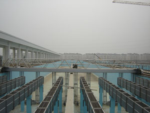 XJY型行車式吸泥機適用于水廠平流式沉淀池和污水處理廠矩型二次沉淀池的沉積污泥排除,按結構形式區(qū)分有虹吸式和泵吸式二種類型,一般地面式沉淀池選用虹吸式吸泥機,地下式沉淀池選用泵吸式吸泥機。 虹吸式吸泥機采用潛水泵配合水射器或真空泵配合氣水分離器完成管路真空的形成,利用液位差壓完成虹吸排泥;泵吸式吸泥機采用潛水泵直接抽吸排泥。XJY型行車式吸泥機采用雙驅動結構形式,傳動平穩(wěn)、運行可靠,同時可根據(jù)沉淀池不同泥量設定每天排泥次數(shù)。與設備配套的控制及信號電纜可采用電纜卷筒、安全滑觸線或移動電纜。目前,用戶有本溪自來水公司,上海嘉定自來水公司,西寧市第七水廠等。